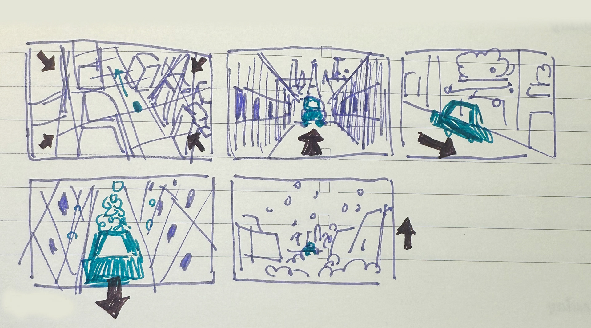Every good design starts with a sketch. Before touching any AI, I drew rough storyboards to define the narrative arc: a journey of gift-giving through a soft, pastel world.